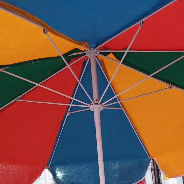 چتر سایبان از جنس برزنت و اسکلت آهنی بسیار محکم و پایه وسط که سایه آن بسیار خنک میباشد ضد آب نیست و برزنتی مناسب آفتاب است دارای یک لوله برای تنظیم ارتفاع و یک پایه برای ایستادن کف زمین است تا شوبوده و در صندوق ماشین قابل حمل است