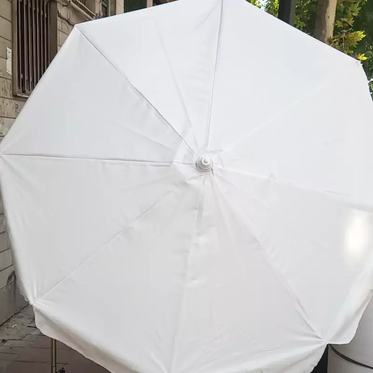 چتر قطر 2 متر با لوله و پایه آهنی ضد آب رنگ سفید ارتفاع از 160 تا 210 سانت قابل تنظیم یک رو پی وی سی یک رو برزنت وزن کامل حدود 7 کیلو اسکلت آهنی محکم