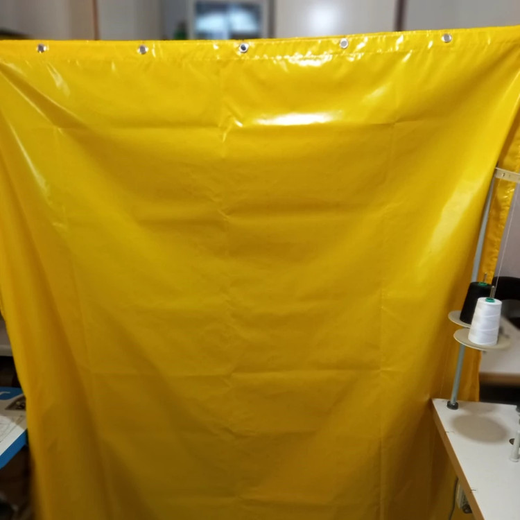 برزنت ضدآب شمعی دوخت پرده حیاط و بالکن و راه پله برای جلوگیری از ورود سرما و آب همراه با حلقه پرسی و نوار دوزی و دور دوخت رنگ زرد ابعاد ۲ در ۱.۷ متر طول
