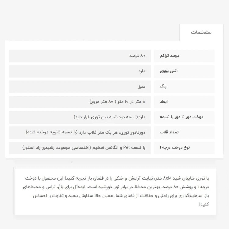 توری سایبان شید، آنتی یووی دار بوده که از اشعه خطرناک خورشید جلوگیری میکند و دربرابر آفتاب مقاومت بالایی دارد. دوخت درجه 1 (منظور تسمه و دوخت بسیار قویتر میباشد)، یک تسمه محکم دورتا دور توری، و هر متر یک قلاب با تسمه ثانویه دوخت خورده است. توری سایبان شید، برخلاف برزنت، هوا را خف نمیکند و هوا در جریان هست و وزن سبکی دارد که دیگر نیازی به سازه سنگین برای نصب، مثل برزنت ندارد. همچنین ارزان تر و با دوام تر است. تراکم توری 80 درصد بوده که یعنی 80 درصد جلوی نور خورشید را میگیرد، در واقع سایه دهی آن حداقل 80 درصد است. این میزان سایه برای بخش عمده نیاز افراد کاربرد دارد، مثل سایه برای خودرو، استخر، حیاط و ... حتی برای گل و گیاهان هم، جلوی سوختگی برگ ها در بهار و تابستان میگیرد ، در زمستان، برای برخی گیاهان، باعث کاهش رشد میشود ولی خرابی گیاه را در پی ندارد.