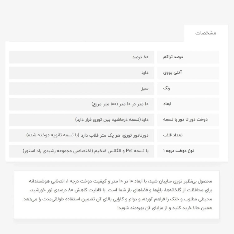 توری سایبان شید، 80 درصد، انتی یووی دار بوده که از اشعه خطرناک خورشید جلوگیری میکند و دربرابر آفتاب مقاومت بالایی دارد. دوخت درجه 1 (منظور تسمه و دوخت بسیار قویتر میباشد)، یک تسمه محکم دورتادور توری، و هر متر یک قلاب با تسمه ثانویه دوخت خورده است. توری سایبان شید، برخلاف برزنت، وزن سبکی دارد و هوا را خف نمیکند، یعنی هوا در جریان هست. همچنین ارزان تر و با دوام تر میباشد. این ابعاد چون بزرگ میباشد، اطلاع دهید که با پست ارسال شود یا باربری