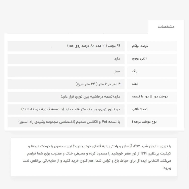 توری سایبان شید، 4در6، 99درصد پلاس (2لایه80درصد)